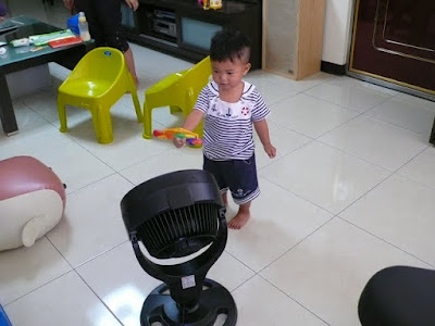 YK也會坐在小椅子上邊吹電風扇邊玩風車,易朋也會搶著要一起玩呢